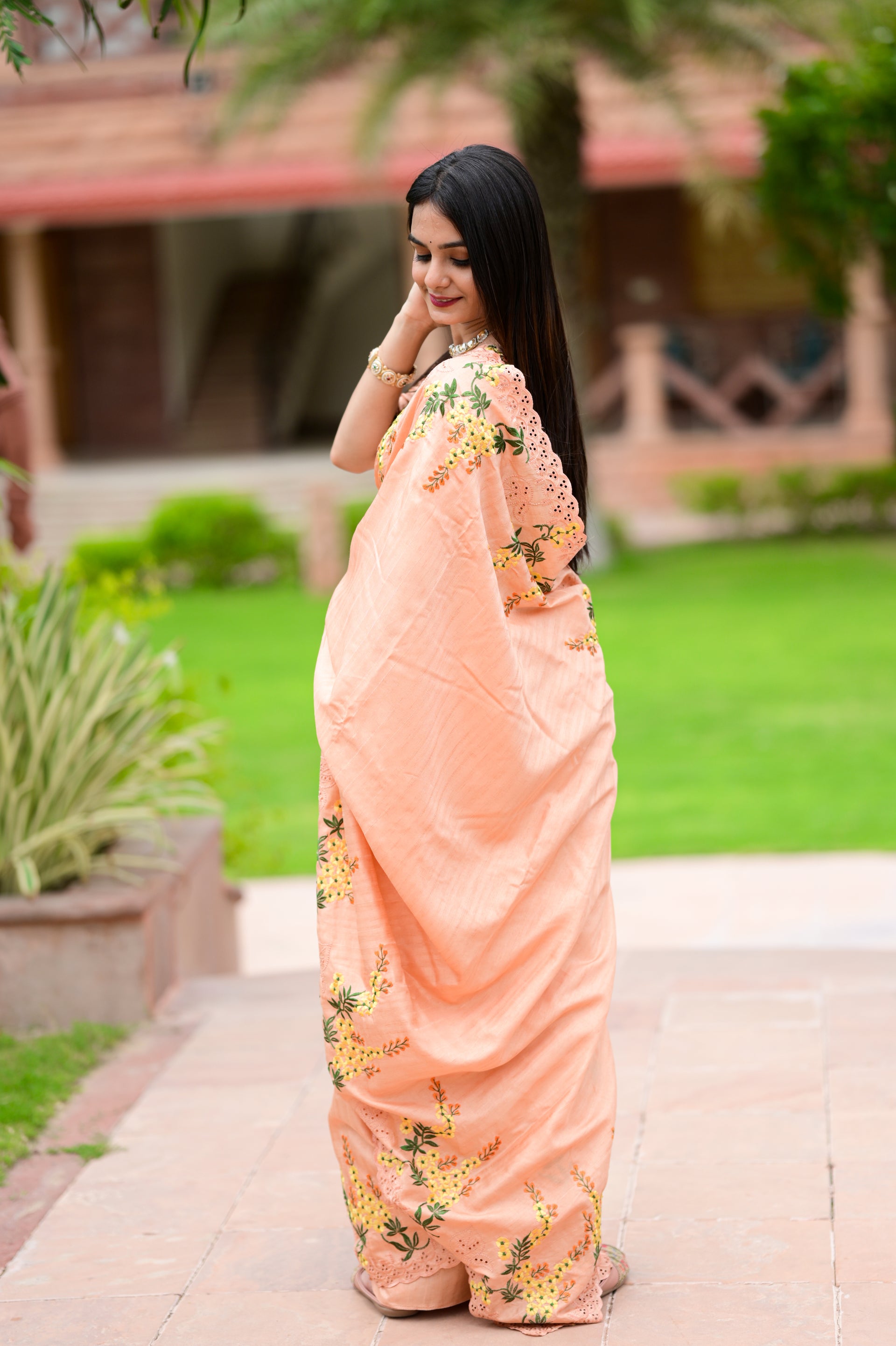 Cream Visca Slub Silk Embroidered Work Saree With Unstitched Blouse For Women